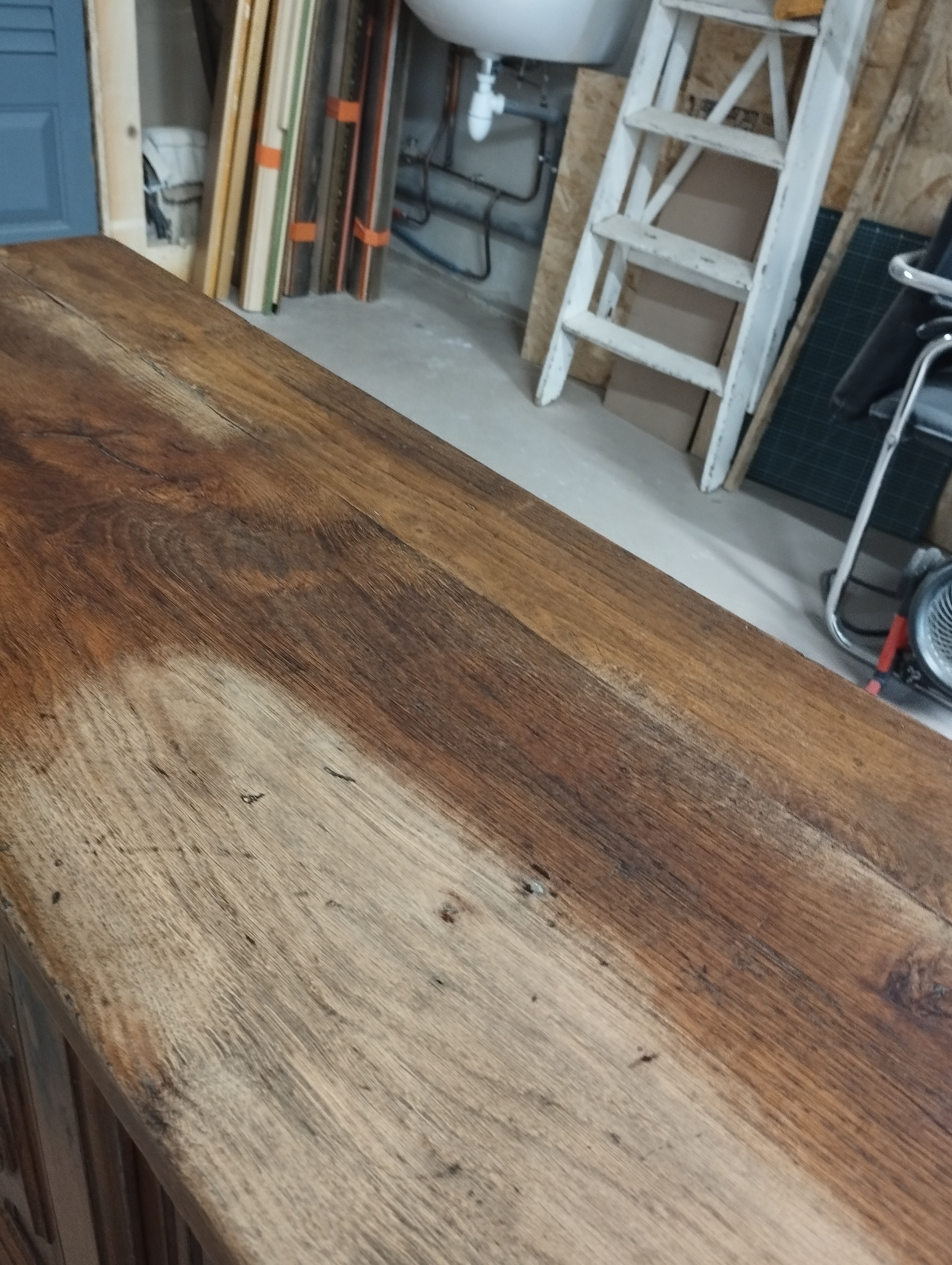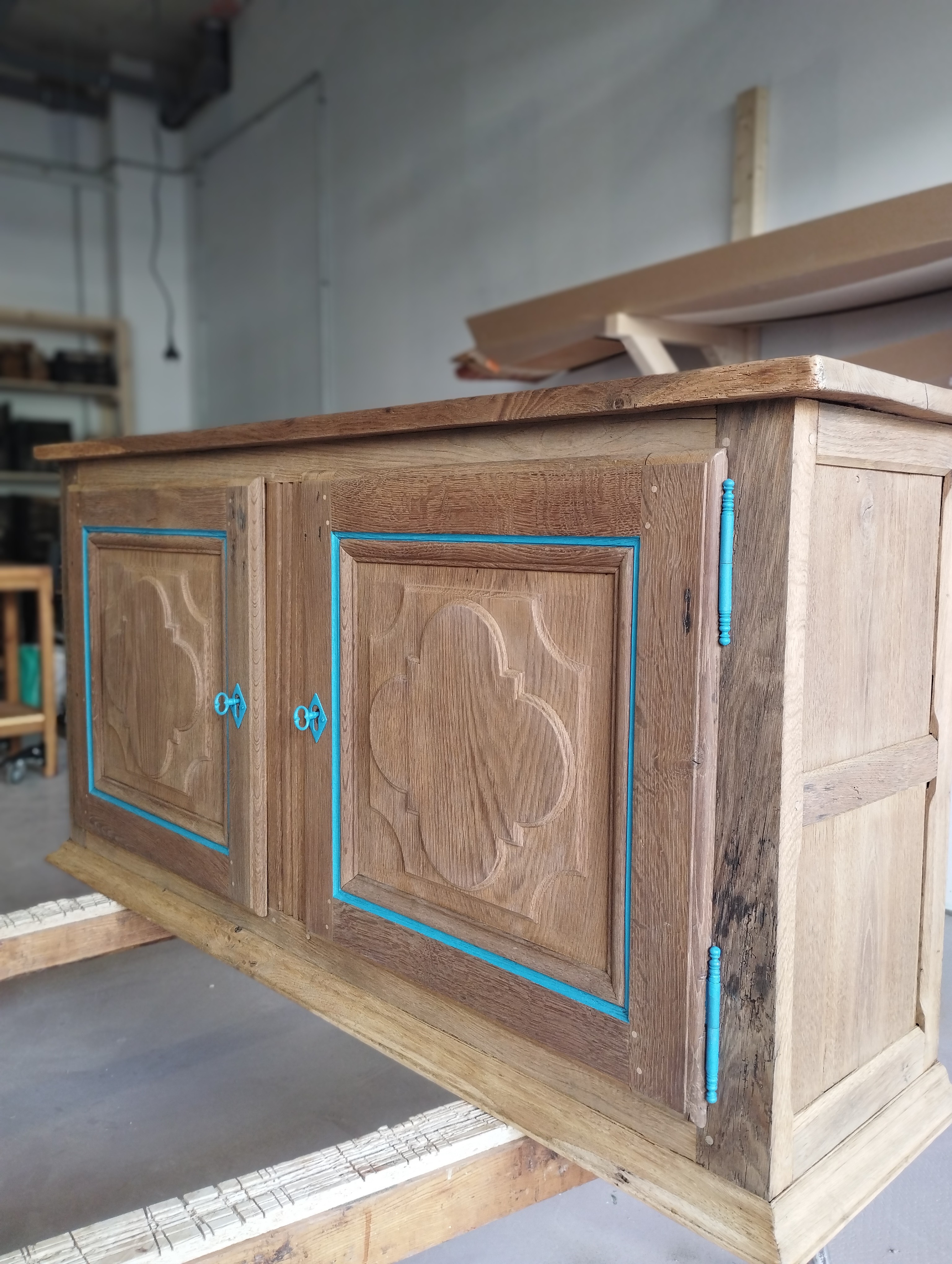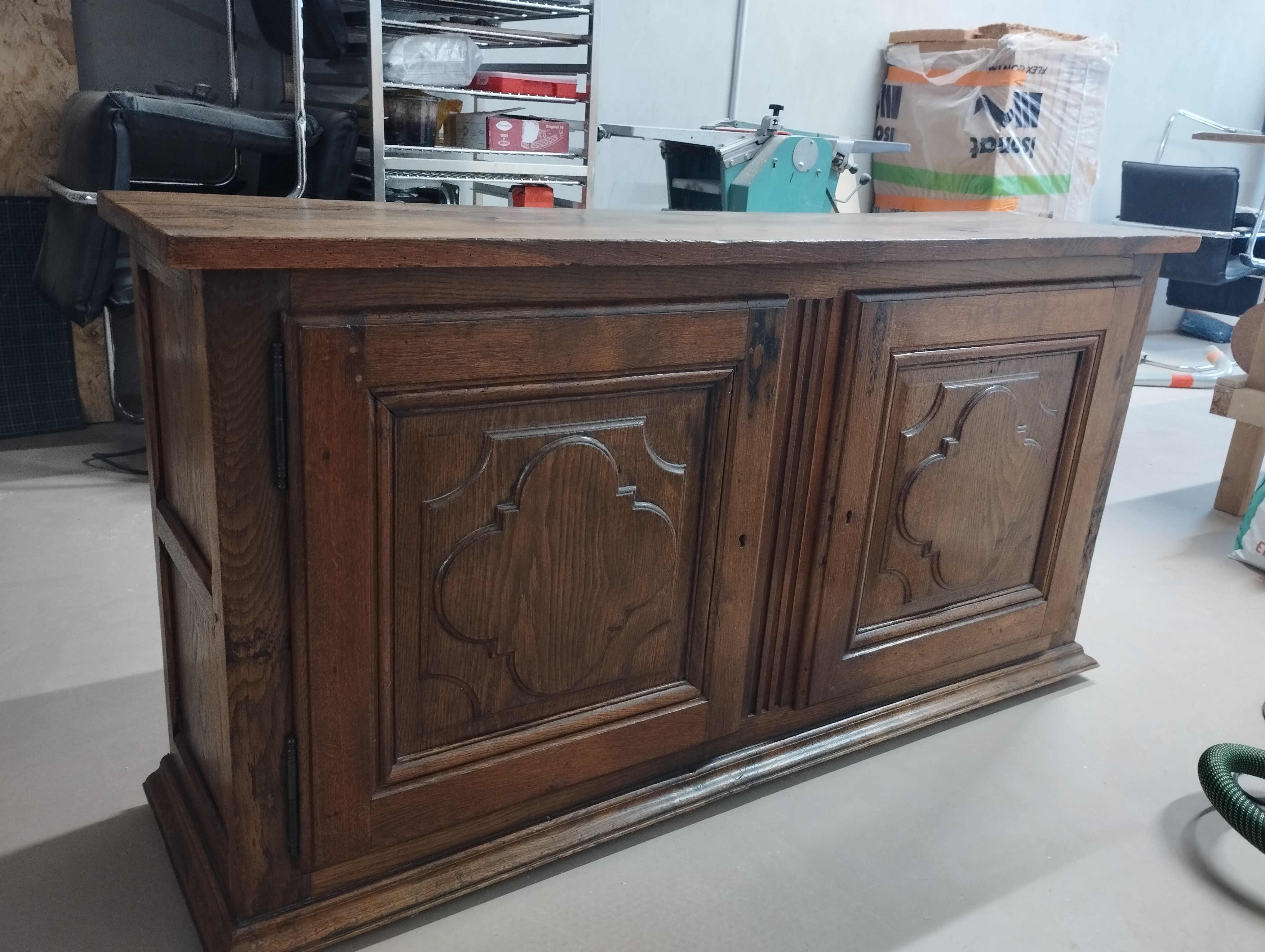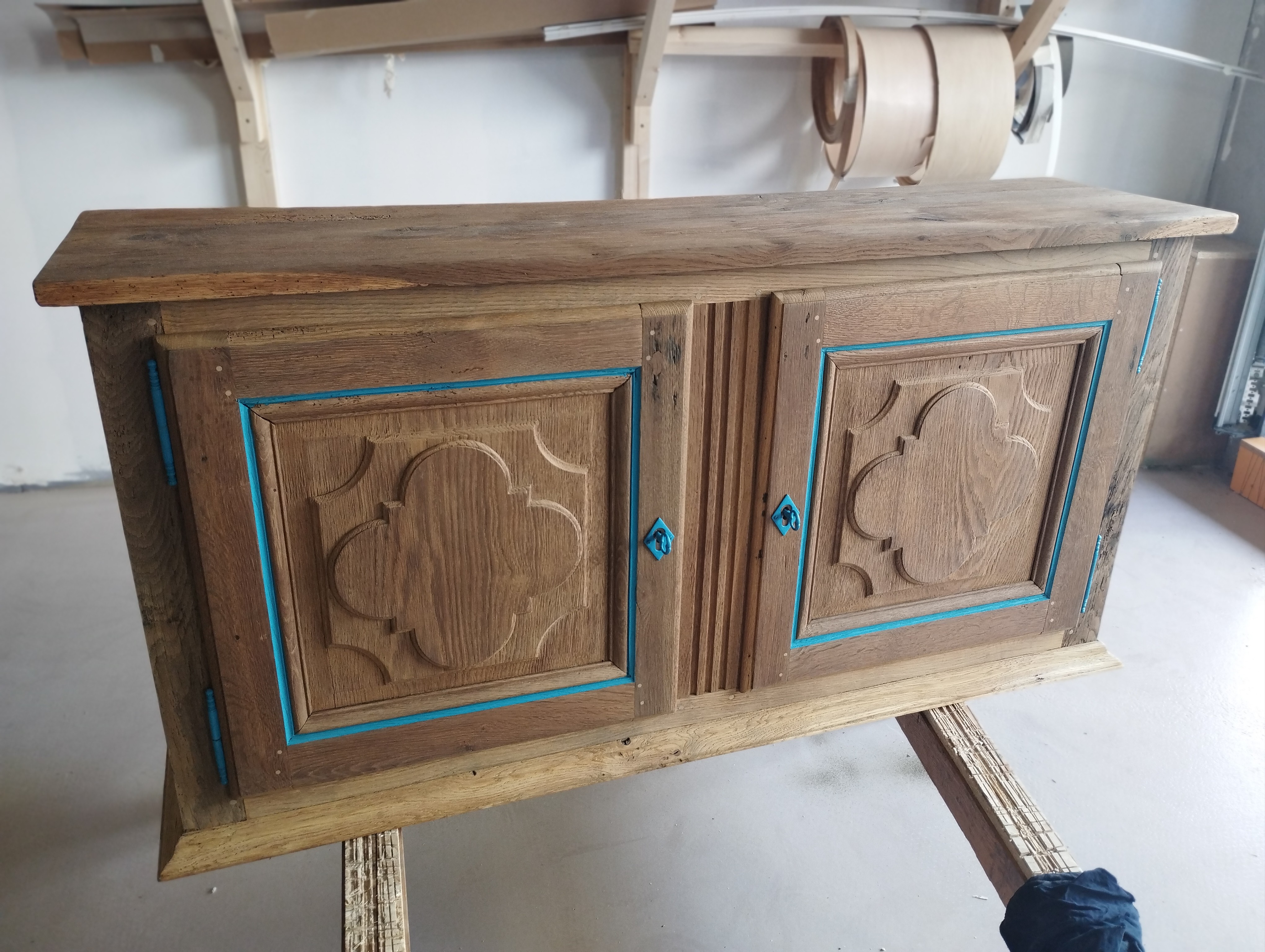Ce projet de relooking concerne un buffet en chêne massif dont les propriétaires souhaitaient se séparer de la teinte sombre, devenue moins en accord avec leur intérieur, tout en conservant le meuble dans une démarche respectueuse et durable. Le meuble a été sablé puis poncé afin de retrouver la teinte naturelle du chêne, apportant plus de clarté et de légèreté à l’ensemble. Une touche de peinture vient souligner les moulures et apporter une note de modernité, tandis qu’un vernis incolore assure la protection et la finition de cette restauration.